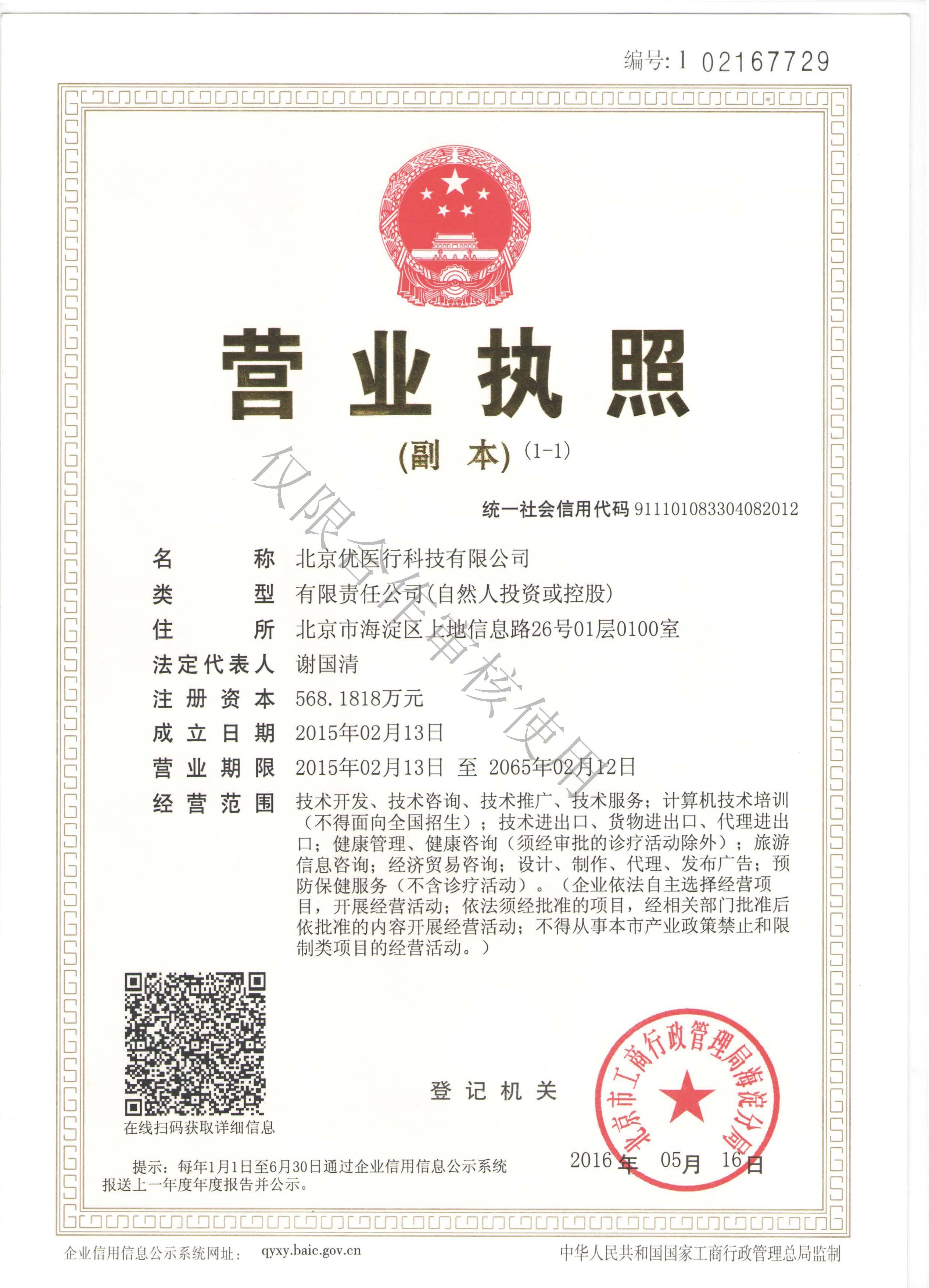 北京优医行科技有限公司于2015年2月在北京中关村创业园注册成立。